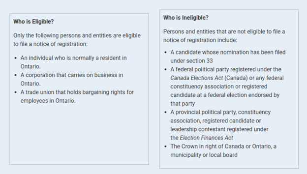 Ontario residents, corporations and trade unions that will incur expenses for advertisements related to the promotion, support or opposition of a candidate in any broadcast, print, electronic, or other medium must register as a third party advertiser. They can begin filing their Notice of Registration on Friday, May 1, 2026, by appointment only. The last day to register as a Third Party Advertiser is Friday, October 23, 2026.